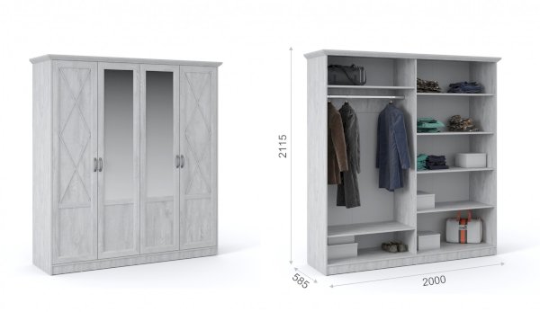 Распашной четырехдверный шкаф выполнен в популярном стиле неоклассика – белые рамочные фасады с фактурой и рисунком натурального дерева, декоративные крестообразные накладки, фигурные ножки и карниз все это придает комнате элегантный и светлый вид. Вместительные отделения со штангой и полками поместит в себя верхнюю одежду, коробки с обувью и головные уборы. Мебель выполнена из экологичных материалов.