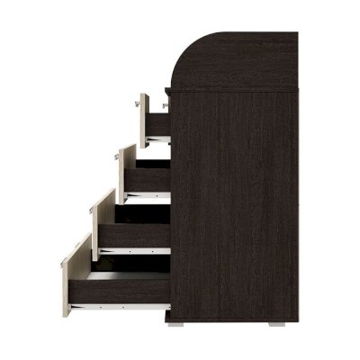 Ширина комода – 800 мм и для облегчения открывания нижние выдвижные ящики оснащены одновременно двумя ручками геометрической формы. Верхний – разделен на две секции для более удобного хранения. Сочетание в модели Стандарт №1 корпуса цвета венге и фасадов в светлом оттенке лоредо позволит комоду украсить любой интерьер.