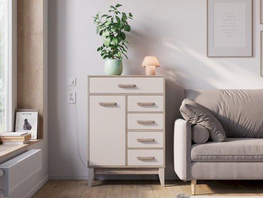 Комод «Скандика» КмМ-13 – это компактная, но вместительная модель для гостиной или спальни. Благодаря вытянутой форме комод можно разместить на небольшом пространстве – например, возле дивана. Комод укомплектован четырьмя ящиками и отсеком с дверцей. В этой модели можно организовать несколько зон хранения, в ней поместятся и мелочи для рукоделия, и документы, и одежда. Створка плотно фиксируется на магнитах.