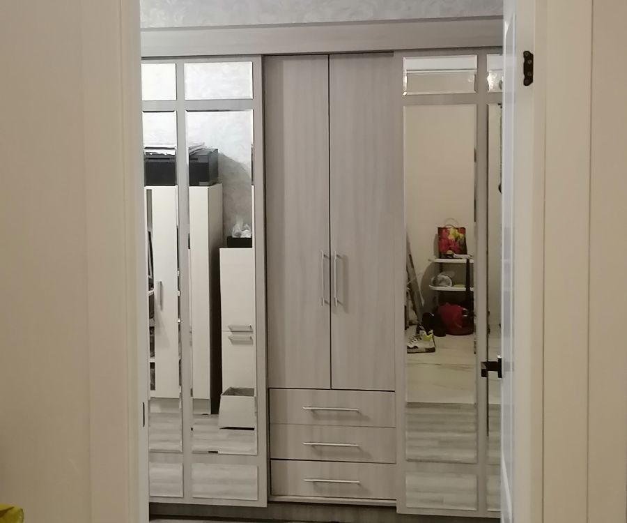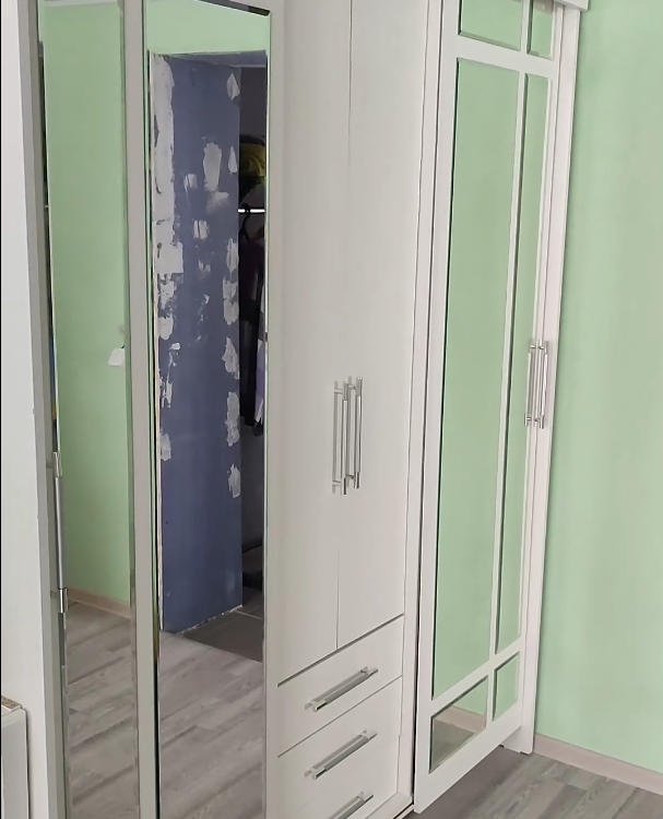 У раздвижных зеркальных дверей видна щель, если смотреть на шкаф с боку! Собрали согласно инструкции.