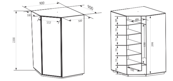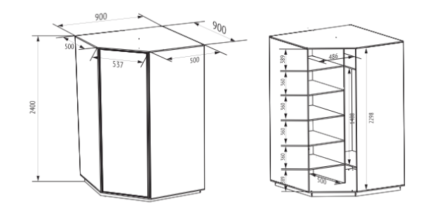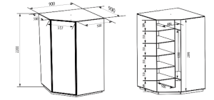 • Солидное наполнение: с левой стороны углового шкафа располагается 5 полок, с правой — две полки и штанга для одежды