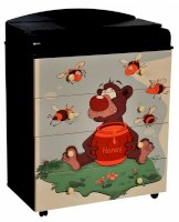 Пеленальный комод 800/4 Lilu 4 отличается привлекательным дизайном с использованием тематических детских принтов. В конструкции изделия предусмотрены 4 маленьких передвижных колеса, несколько вместительных ящичков на шариковых направляющих и откидывающаяся пеленальная столешница. Детский пеленальный комод, декорированный красочным рисунком, вмещает в себя постельные принадлежности, средства гигиены, распашонки, подгузники, игрушки, ползунки и другие личные вещи ребенка. Гладкая столешница идеально подходит для пеленания ребенка, а колесики позволяют быстро перемещать комод.