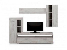Состав композиции: настенная полка (ВхШхГ): 1499 х 300 х 268 мм; навесной шкаф (ВхШхГ): 1200 х 601 х 440 мм; напольный шкаф (ВхШхГ): 1351 х 800 х 440 мм; ТВ-тумба (ВхШхГ): 514 х 200 х 440 мм. Размер ниши под ТВ (ВхШ): 1099 х 1119.