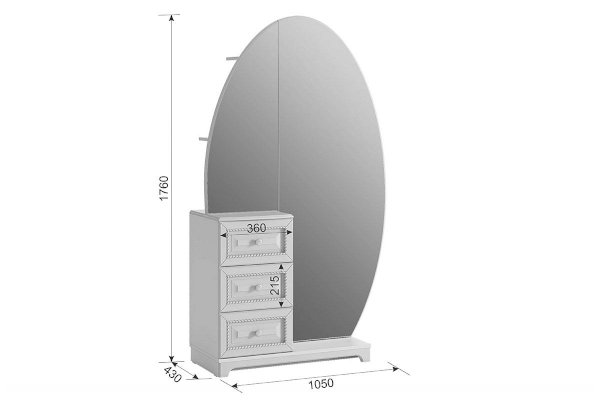 Состоит из: 3-х выдвижных ящиков, зеркала, стеллажа с полками, расположенным за зеркалом.