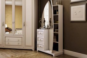 Этот утонченный элемент интерьера украсит собой любую спальню. Совмещает в себе как функционал трюмо, так и вместительного шкафа. Множество скрытых зеркалом полок позволит хранить в нем максимальное количество вещей и аксессуаров. Столешницу из МДФ украшает фрезеровка. На фасады выдвижных ящиков нанесен фрезерованный рисунок.
