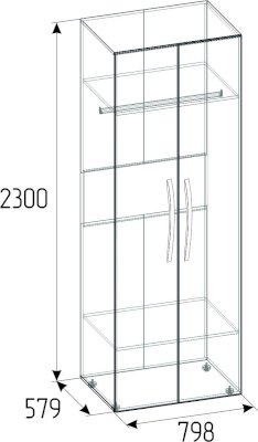 Распашной шкаф для одежды - классический шкаф для спальни. Фасады с ручками, укутанными в экокожу. Шкаф комплектуется стационарной штангой длиной 757 мм, на которой можно разместить до 10 плечиков с верхней одеждой, а также двумя полками. Регулируемые опоры компенсируют незначительные неровности пола.