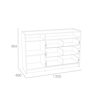 Тумба оснащена тремя выдвижными ящиками со встроенной перегородкой для удобного хранения вещей, а также распашной дверкой с полками и открытой нишей, чтобы легко расположить косметику или украшения, а также документы, если использовать тумбу в домашнем кабинете. Черные лаконичные ручки идеально контрастируют на песочном фасаде.