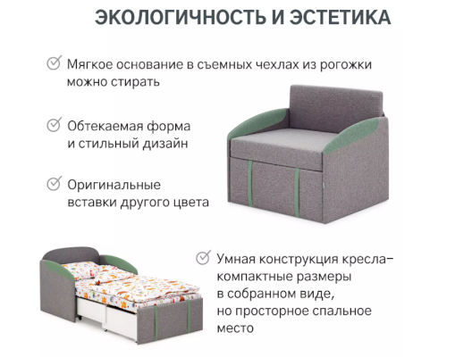 Обтекаемая форма и стильные расцветки колор-блок подойдут под любой дизайн. Умная конструкция кресла – компактное в сложенном виде, но просторное спальное место.