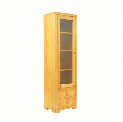 Этот однодверный шкаф имеет четыре полки за дверью из прозрачного стекла в деревянной раме. В нижней части витрины расположены два ящика с плавным механизмом выдвижения.  Эта простая и удобная конструкция в силу своей лаконичности будет всегда популярна и актуальна. Массив сосны, из которого изготовлена витрина, позволит мебели сохранить свои высокие эксплуатационные свойства и безупречный внешний вид на протяжении многих лет.