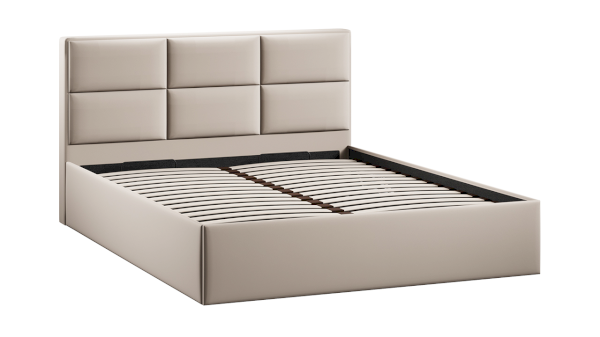 Каркас кровати усилен поперечной и продольной опорами, что гарантирует максимальную устойчивость конструкции. Важной и функциональной деталью также является возможность рационального хранения, поэтому кровать оборудована подъемным механизмом, обеспечивающим верхнюю фиксацию и удобный доступ к месту для хранения.