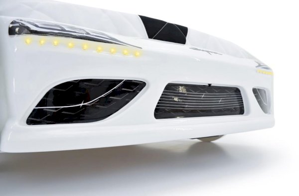Каркас кровати выполнен из экологичного ЛДСП класса эмиссии Е1, соответствует всем стандартам качества. Кровать оборудована объемным бампером из ABS-пластика, к нему прилагаются наклейки в виде фар, радиаторной решётки и логотипа автомобиля. Все края кровати покрыты кромкой ПВХ 1 мм и безопасны для малышей.