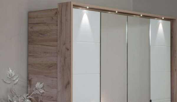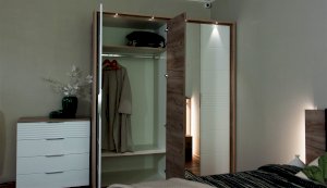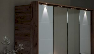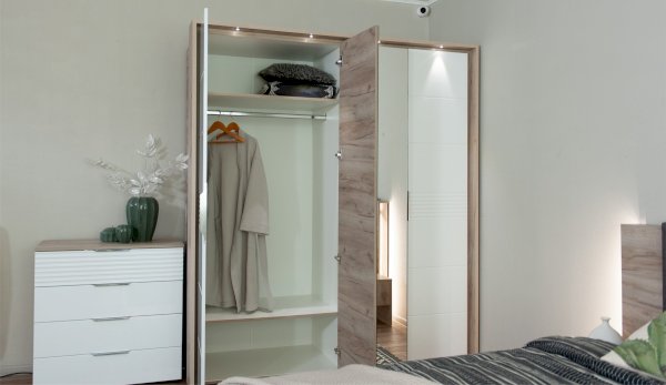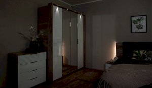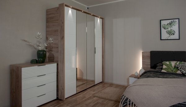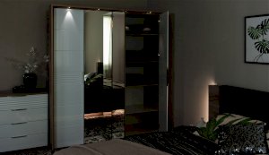 Современный распашной шкаф Джулия яркий представитель европейского минимализма. Это шкаф-конструктор, который позволяет выбрать подходящий вам размер, его наполнение и дизайн. На базе корпуса можно создать множество комбинаций: с зеркалами, с глухими глянцевыми фасадами, с порталом из ЛДСП 22мм или без него. Дополнительная опция – светодиодная подсветка монтируется в верхней части портала над каждой дверью. Шкаф выполнен из экологически безопасных надежных материалов. Декором белым глянцевым фасадам High Gloss служит фрезерованный рисунок «Волна» - подчеркивает зеркальный блеск, делает интерьер спальни особенным и неповторимым. Торцевые ручки из хромированного металла - яркий акцент фасадов. Наполнение шкафа включает в себя вместительные полки и отделения со штангой, что позволяет создать систему для хранения вещей различного назначения. Идеально компонуются со всеми модулями системы Джулия.