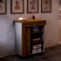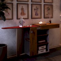 Невероятно практичная вещь – тумба Тео. Все дело в ее многофункциональности, ведь при необходимости модель с легкостью трансформируется в гладильную доску. Изделие дополнено полками, на которых можно хранить утюг и необходимые вещи, а также колесиками для большей мобильности. Тумба точно выручит владельцев малогабаритных квартир.