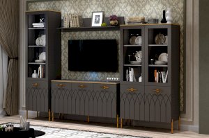 • МДФ фасады с завершающей пленкой ПВХ с поверхностью soft touch особенно популярны на рынке мебельной моды. Эффектный дизайн витрины включает фигурную фрезеровку фасадов, золотую кромку по периметру крышки, яркие металлические ручки в цвете золото.