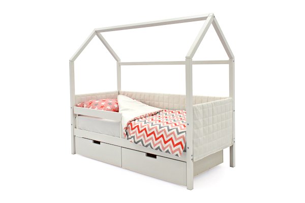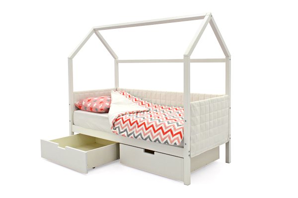 Кровать-домик легко превращается в целый замок для игр с помощью разноцветных тематических игровых накидок. Текстильная крыша на домике создаст ребенку уют и защищенное пространство.