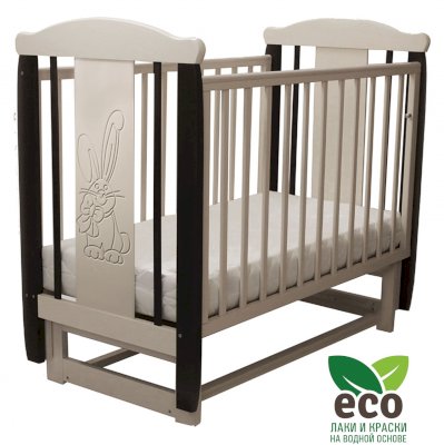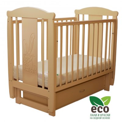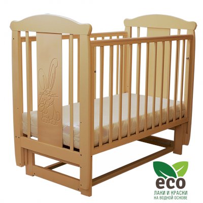 Кроватка декорирована фрезерным рисунком "Заяц с бантом". Уникальные фрезерные рисунки размером от 50 см на обеих спинках.