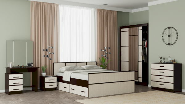Двуспальная кровать Сакура выполнена из ЛДСП высокого качества в контрастных цветах. Данная модель оснащена двумя выдвижными ящиками, в которых можно хранить постельные принадлежности или любые необходимые вещи. Изделие не имеет ножек, а значит избавит вас от скопления пыли под основанием.