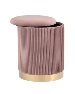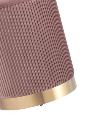 Лаконичная модель пуфа в обивке из мягкого велюра, которая дополнит интерьер в современном стиле. Основание выполнено из металла в золотом цвете. Обивка красиво украшена декоративными оборками. Под сидением имеется ящик для хранения различных мелочей. В основании предусмотрены специальные подпятники, которые делают пуф более устойчивым и предотвращают скольжение.