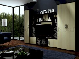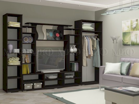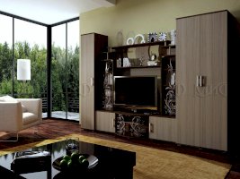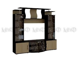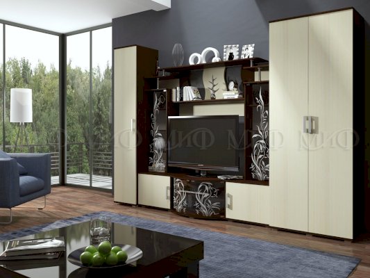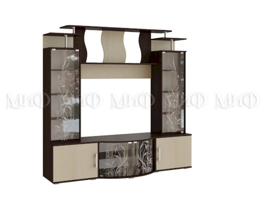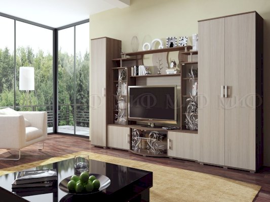 Ясень шимо темный / Ясень шимо светлый Актуальная модель с большой нишей под TV. Стеклянные дверцы стеллажей декорированы растительным узором. Роскошный вариант для стильного интерьера гостиной комнаты.