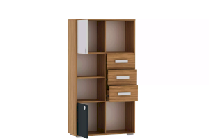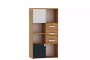 Стеллаж оснащен двумя полками с распашными дверками и тремя выдвижными ящиками, а открытые системы хранения позволяют расставить на видных местах сувениры, книги и украсить комнату так, как нравится ребенку. Для выдвижения ящиков используются шариковые направляющие, которые равномерно распределяют вес содержимого и обеспечивают плавный бесшумный ход ящика. Двери могут крепиться как на левую, так и на правую стенки.