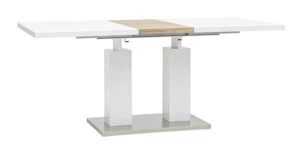Обеденный стол раскладной. Столешница выполнена из прочного и долговечного МДФ. Светлая глянцевая поверхность столешницы гармонично сочетается с металлическими ножками. Простая прямоугольная форма стола позволит легко вписать его в современный интерьер, стол украсит кухню, гостиную или современное кафе, ресторан. Дополнительная вкладка стола выполнена из МДФ с бумажным шпоном цвета беленого дуба. На вкладке предусмотрена петля для комфортного открытия стола одной рукой.